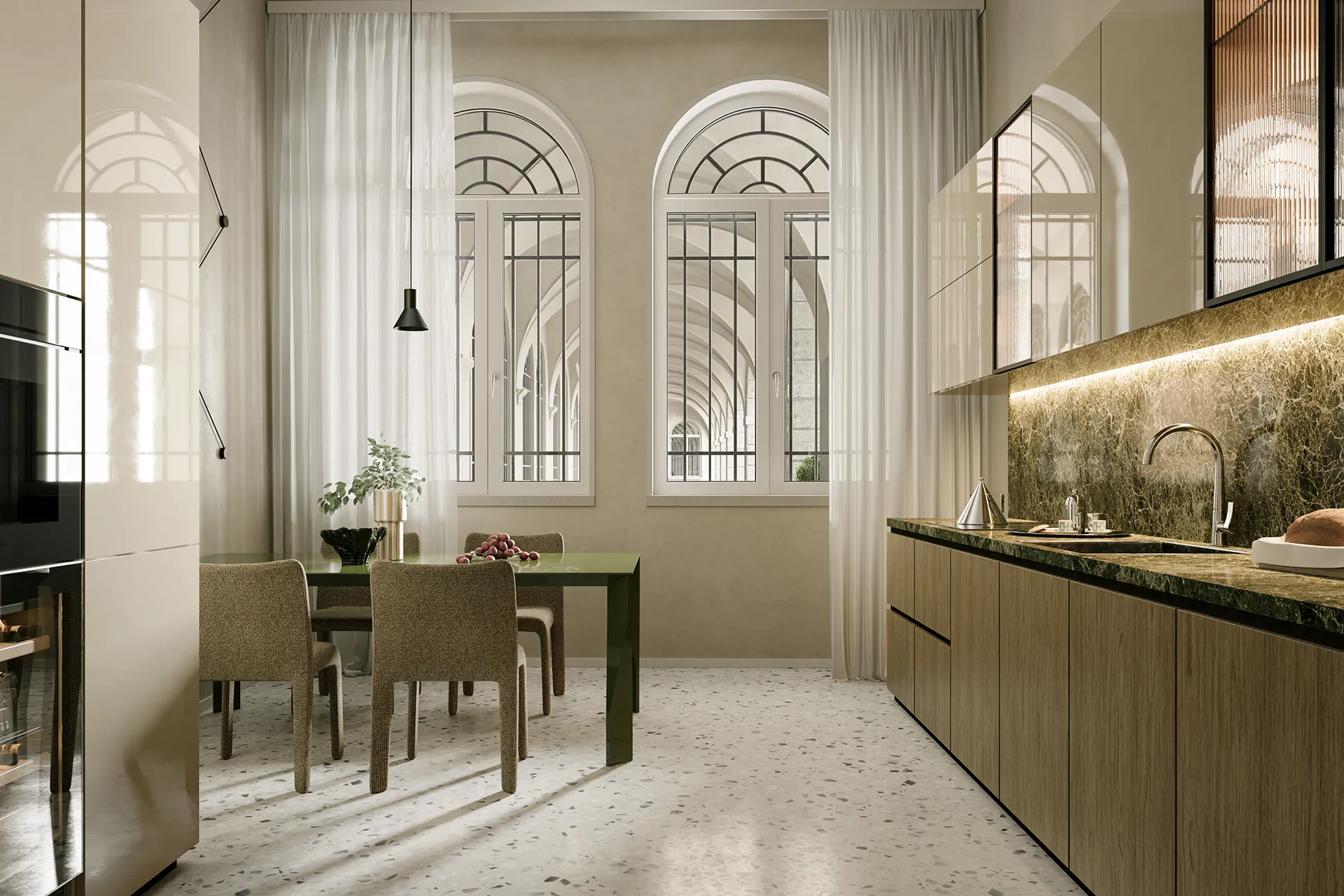 Ogni dettaglio rivela un’attenzione impeccabile alla qualità. In alcune unità, i pavimenti in seminato veneziano, realizzati secondo la tradizione artigianale locale, aggiungono un valore unico e identitario.
